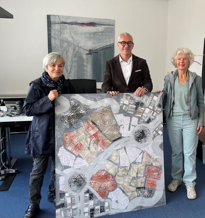 Künstlerinnen des Kunstkreises Karlsdorf-Neuthard überbrachten Bürgermeister Sven Weigt am Montag dieser Woche bei einem seiner letzten offiziellen Termine im Amt ein Bild zum Thema Gemeindefusion.