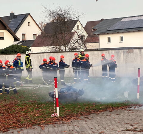 Zunächst startete die Jugendfeuerwehr Karlsdorf-Neuthard das Übungsszenario gegen 16 Uhr und rückte mit drei Fahrzeugen zur Einsatzstelle an. Hier wurde ein Brand am Gebäude angenommen. Parallel wurde die Wasserversorgung vom nahegelegenen Überflurhydrant zum Löschfahrzeug sowie die Angriffsleitungen zur Bekämpfung des Feuers aufgebaut. Hierbei sicherte die Jugend, dass das Feuer sich nicht auf weitere Gebäudeteile ausgedehnt hat.