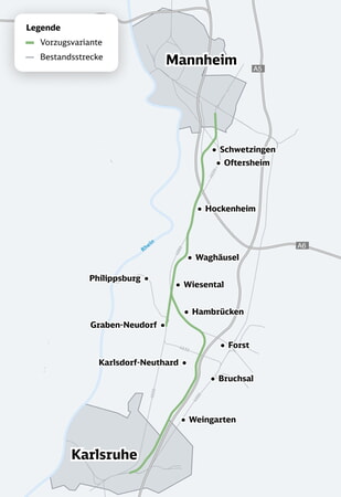 Im Raum Mannheim kann auf Grundlage der Zugzahlenprognose 2030 Deutschlandtakt keine Variante festgelegt werden. (…) Eine höhenfreie Verknüpfung sowie ein zusätzliches Gleis zwischen Wiesental und Graben-Neudorf sorgen für eine reibungslose Weiterführung der Züge Richtung Stuttgart. Die R4 bündelt im weiteren Verlauf mit der Schnellfahrstrecke Mannheim-Stuttgart. Sie führt an Hambrücken vorbei und schwenkt westlich von Forst nach Süden. Entlang der A5 verläuft die Trasse teils im Tunnel, passiert Karlsdorf und Büchenau und folgt der Autobahn bis nach Karlsruhe.