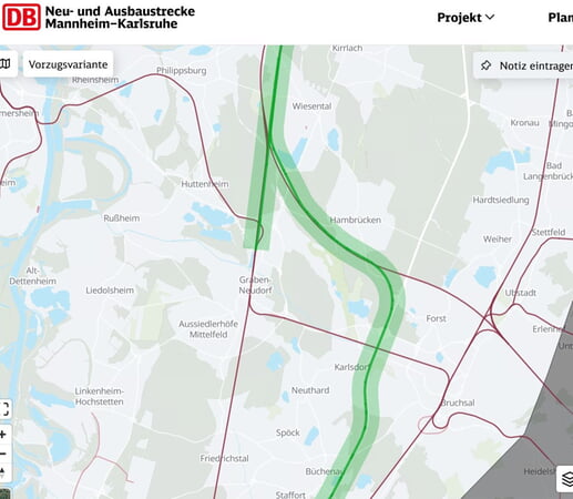 Hinweis: Der Linienverlauf ist in der aktuellen, noch sehr frühen und groben Planungsphase, wie in der interaktiven Karte dargestellt, als etwa 1000 m breiter Korridor zu sehen. Folglich kann der Linienverlauf sich innerhalb dieses Korridors mit fortschreitender Detaillierung der Planung noch einmal anpassen.“